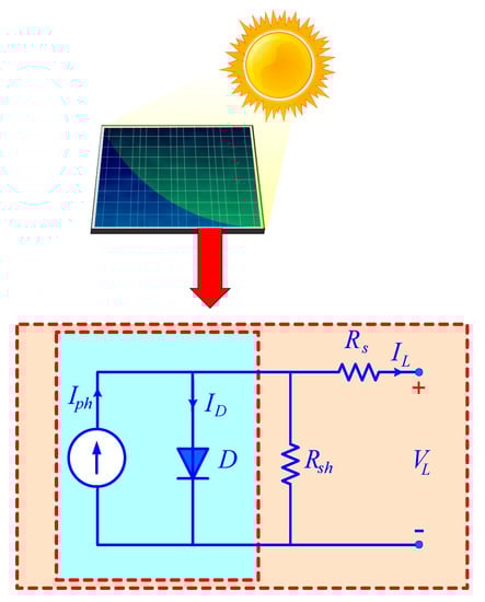 The equivalent circuit of the PV when light is irradiated is depicted in Figure 1. Parallel resistance Rsh represents the leakage resistance represented by a constant resistance, which is beyond the ideal diode characteristics [25]. Since the relationship between the PV voltage and the current is severely nonlinear, modeling of the PV must be preceded in order to perform a full system simulation that can achieve accurate system characteristics.