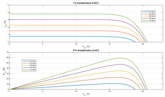 Equation (3) is valid for a certain irradiation level SN and at a particular operating cell temperature Tc. The I-V and P-V characteristics for various irradiation levels at a constant cell temperature can be obtained by measuring the PV, current, voltage, and power, as shown in Figure 2.