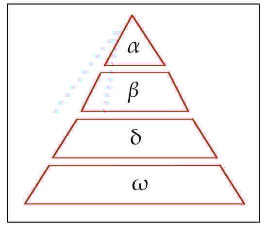 The grey wolf algorithm, which is a meta-heuristic based on the movement used by wolves when approaching prey, is hierarchically subdivided by four types of wolf: Alpha α; Beta β; Delta δ; and Omega ω. This movement is divided into three stages: search for prey; attack; and capture. The adaptation of the movement to the optimization algorithm follows the wolf hierarchy, which takes the shape of a pyramid, as shown in Figure 4 [30].