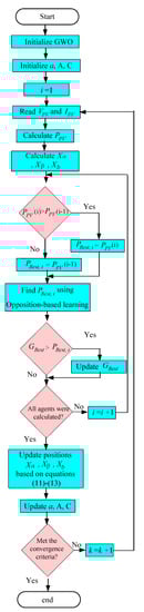 However, the opposition-based learning (OBL) method can direct the search for the best solution by bioinspired algorithms, in the opposite direction of the current search. The process involves that, at a given moment, the agents are together around the best position found, with a decrease in diversity. In this case, this technique allows for a change of positions of some of its agents to the opposite coordinates, exploring new possibilities in the search space [32,33]. Figure 5 presents the flowchart of the opposition-based learning grey wolf algorithm (OGWO).
