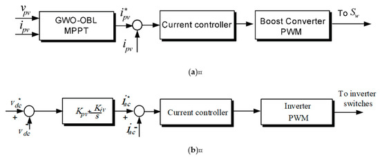 In the grid-connected inverter, DC link voltage control and output stage current control are performed. The controller of the conventional boost converter is controlled to follow the voltage reference signal (vpv*) generated as a result of the MPPT algorithm. The switch is controlled by a gating signal of a current controller, as shown in Figure 7a.