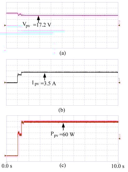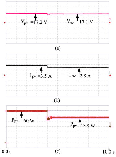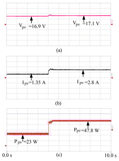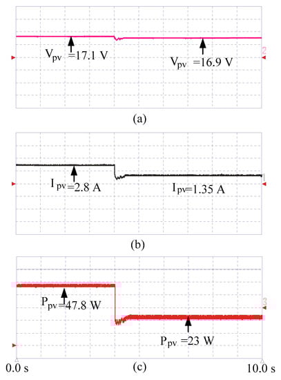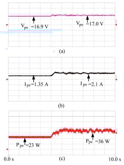 To test the OGWO-MPPT under different irradiance conditions, more semi-transparent sheets were added to cover a wider area of PV array. The tracker very quickly captured the GMPPT, still with a convergence time of less than 1 s. The PV voltage, current, and power are shown in Figure 11a–c.