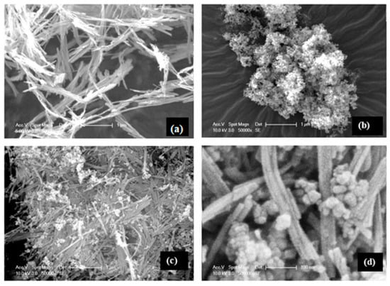 SEM images (50 K magnified) of raw sepiolite (a), P-25 (b) and Sep–TiO2 nanocomposite (c). The last image (d) represents a 500 K magnified surface of Sep–TiO2 to show the distribution of the particles.