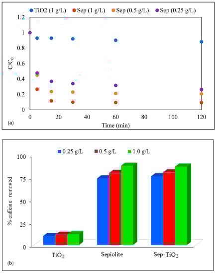Adsorption equilibrium of caffeine on increasing concentrations of pristine TiO2 and raw sepiolite (a); comparison of pristine TiO2, raw sepiolite and Sep–TiO2 nanocomposite for total caffeine adsorption after 2 h contact (b). Initial caffeine concentration = 10 mg L−1, pH = 3.0.