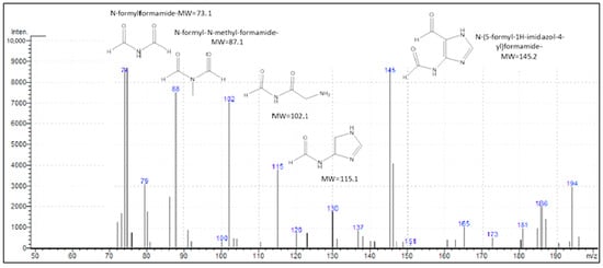 The reaction byproducts. LC–MS analysis of a sample withdrawn from the reactor after 15 min photocatalysis with TiO2 revealed six major peaks with m/z ratios of 73, 88, 100, 115, 145 and 194. The spectral output and the predicted structures of the detected byproducts are presented in Figure 3. The results are in good agreement with the literature reporting •OH-mediated degradation of caffeine by advanced oxidation with Fenton’s reagent []. Hence, in the presence of P-25, the major mechanism governing the degradation process was advanced oxidation with OH radicals.