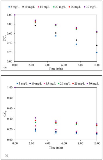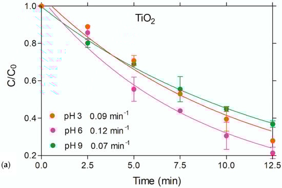 The analysis of the data in Figure 4b to explore the reaction kinetics in the presence of Sep–TiO2 showed that the degradation reaction was represented by the Langmuir–Hinshelwood rate model (Equation (1)), which is commonly used to model heterogeneous reaction kinetics based on the assumption that adsorption and desorption are in equilibrium []: