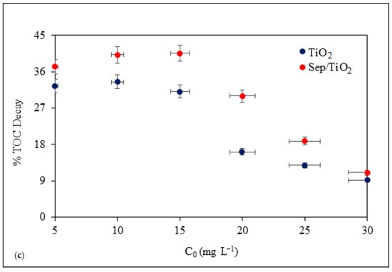 Effect of initial concentration. Monitoring the concentration of caffeine during reaction in the presence of the two catalysts (P-25 and Sep–TiO2) showed that the degradation of caffeine as a function of time exhibited different kinetic patterns, as depicted in Figure 4. The rate of reaction in the former was pseudo-first order (Figure 4a) and decreased as the initial caffeine concentration was increased. Maximum degradation was observed at the lowest test concentration of the compound (5 mg L−1), with a rate constant of 0.098 min−1. On the other hand, the degradation in the presence of the nanocomposite followed an exponential decay pattern (Figure 4b), with an extremely high rate constant during the first 2 min. The comparison of the effect of initial caffeine concentration on carbon mineralization showed that the maximum and minimum degrees of TOC decay were obtained at an initial caffeine concentration of 15 and 30 mg L−1, respectively, regardless of the catalyst used. However, while the maximum in the presence of pristine TiO2 was 31%, that in the presence of Sep/TiO2 was 41%, as depicted in Figure 4c.