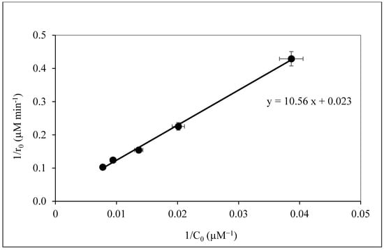 where R0 is the initial reaction rate (M min−1), k is the apparent reaction rate constant (M min−1), K is the adsorption equilibrium constant (M), and C0 is the initial caffeine concentration of (M). The data are presented in Figure 5.