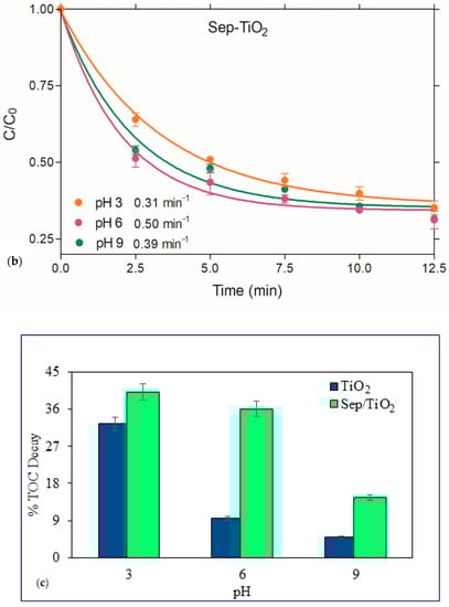 Interactive effects of pH and TiO2 structure on the rate of caffeine degradation with TiO2 (a) and Sep–TiO2 nanocomposite (b); and carbon-mineralization by photocatalysis (c).