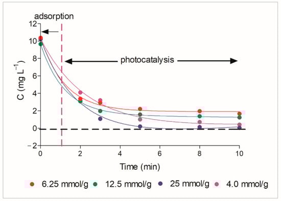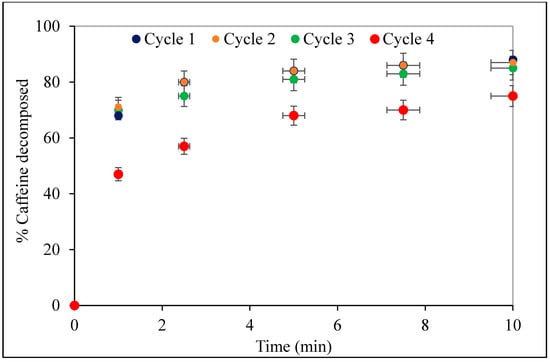 One of the most important features of a solid catalyst is its stability, which is defined as the ease of recovery and the loss of efficiency upon multiple use []. To test the stability of the nanocomposite, a 10 min-treated sample in the photoreactor was adjusted to pH 12 and kept inert for 1 h to allow desorption. The spent catalyst was recovered by filtration, washing and drying at 60 °C to make it reusable in another photocatalytic run. The procedure was repeated with the same catalyst for two additional cycles.