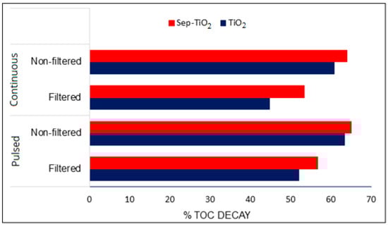 In the light of the above, we tested the impact of post-sonication by exposing 10 min photo-treated samples of caffeine to high frequency ultrasound (577 kHz) for 30 min. The samples were either filtrated to remove all solids from the solution or used without filtration to elucidate the effect of solid catalysts during sonication. Because there was almost no caffeine in the samples, we monitored only the TOC content of the solutions before and after the pulse and continuous modes of sonolysis. It was found that the operation mode made little or no difference on the degree of TOC decay, but the presence of the catalysts did, as the percentage of carbon mineralization increased to a maximum of 65.13 (from 36.09) and 52.1 (from 9. 64) when sonication was applied in the presence of Sep–TiO2 and TiO2, respectively. The results are presented in Figure 8. The higher efficiency of sonolysis in the presence of the catalysts is due to the excess number of cavity nuclei (excess collapse events) and the likely excitation of the catalyst surfaces (particularly that of P-25) by the sonoluminescence of collapse that is made by an intense UV irradiation of 200–500 nm []. The mineralization observed in the filtered samples was the result of sono-generated •OH and the enriched hydrophobicity of the solution that facilitates the diffusion of solutes to the vicinity of cavitation bubbles, where the concentration of hydroxyl radicals is very high.