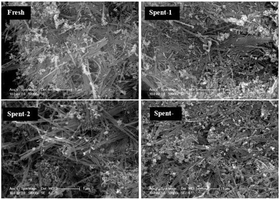 Finally, the stability of the catalyst was confirmed by SEM images of the spent catalyst, which showed that almost no surface damage was present in the second and third uses even after 30 min reaction and a slight damage (reduction of voids) in the last one, as depicted in Figure 10.