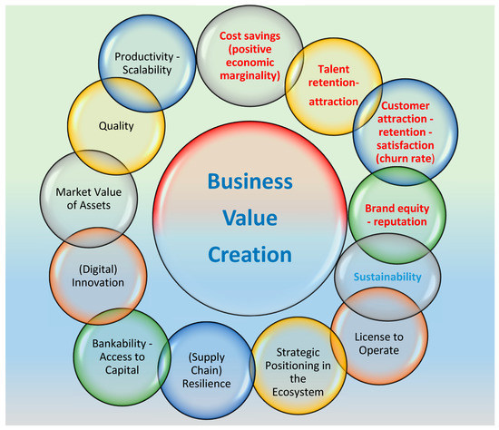 From another point of view, the UK Green Building Council [48] identified 11 value drivers for built environment businesses. A value driver is defined as “Any variable or factor (i.e., a resource, activity or condition) that can be influenced, measured, managed and controlled and, in turn, affects the value of the business by one or more of the following means: reduces risk, increases profitability, leads to future growth in profitability”. In this context, sustainable business activities positively interact with many value drivers. Specifically, the main four value drivers proposed by the UKGBC members are highlighted in red in Figure 2. The other complementary drivers impact the business model, shaping the identity and business purpose, and contributing to the overall economic sustainability. FinTechs can be considered here as a complementary catalyzer for scalability, bankability, digital innovation, etc.