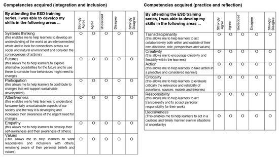 - Sleurs, W. Competencies for ESD (Education for Sustainable Development) Teachers. A Framework to Integrate ESD in the Curriculum of Teacher Training Institutes; Comenius 2.1 Project; CSCT: Brüssel, Belgium, 2008. Available online: http://www.unece.org/fileadmin/DAM/env/esd/inf.meeting.docs/EGonInd/8mtg/CSCT%20Handbook_Extract.pdf (accessed on 30 October 2020).