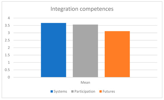 The horizontal axis of the subsequent figures (Figure 2, Figure 3, Figure 4 and Figure 5) shows the different competences. The vertical axis shows the ratings of the different competence developments, from 1 being “strongly disagree” to 5 being “strongly agree”. Looking at the first subcategory, integration competences, it can be said that participants’ self-assessment indicates that the systems and participation competences were developed by the training programme. Only one participant indicated “strongly disagree” in the survey. However, this participant gave this response throughout the entire survey. Therefore, that participant showed no development of any competences across the programme as a whole. The mean scores were 3.67 for the systems competence, 3.11 for the futures competence and 3.56 for the participation competence.