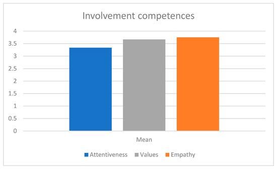 The second subcategory, involvement competences, showed high numbers for empathy and values competences. The development of empathy skills, apart from one person, who was not able to judge this question, was ranked especially high, with a mean score of 3.75. The values competence had a mean score of 3.67 and the attentiveness competence a mean of 3.33.