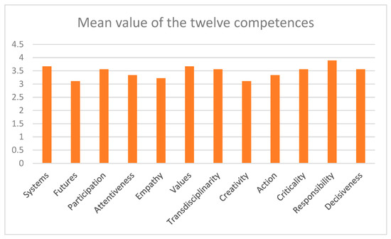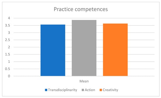 The third subcategory, practice competences, generally showed high scores for all three competences, ranging from a 3.88 mean for action, to a 3.63 mean for creativity, to 3.56 for transdisciplinarity.