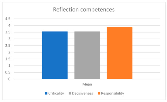 The final subcategory, reflection competences, had the highest mean with the responsibility competence at 3.89. The other two competences, namely criticality and decisiveness, both had a mean of 3.56.