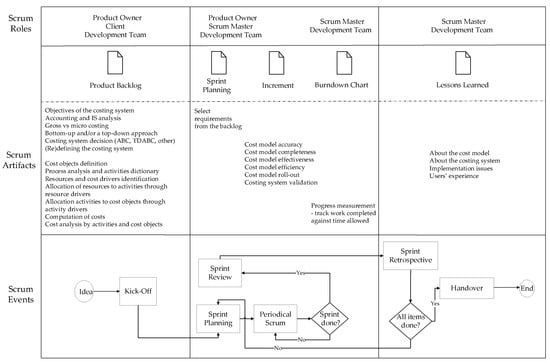 Furthermore, costing systems implementation face growing challenges, which begin in the design stage. On the one hand, due to the gradual complexity of cost systems over time and the multiple skills required of a project’s team to guarantee system’s integrity, reliability, availability, maintenance, and security. This fosters the need for approaches that promote a higher commitment, a higher level of accountability, and a focus on results [72]. Therefore, the design and implementation of a costing system is a complex project that benefits from the use of an appropriate project management approach. This paper proposes the use of an agile project management approach, by developing a Scrum-based methodology for the design and implementation of costing systems. The cost model is particularly based on ABC, but the general principles of the methodology proposed can be applied for other costing systems. Detailed guidance is provided for applying the methodology, through a set of clearly defined roles, events, and artifacts.