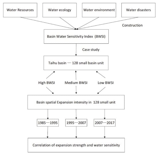 Specifically, this study applied the constructed Basin Water Sensitivity Index in the study area of Taihu Basin and, by analyzing the correlation between the BWSI and the spatial expansion intensity for developed land over the past 30 years in the Taihu Basin, attempted to reveal the internal relationship between the BWSI and local expansion and development. The research flow chart is shown in Figure 1.