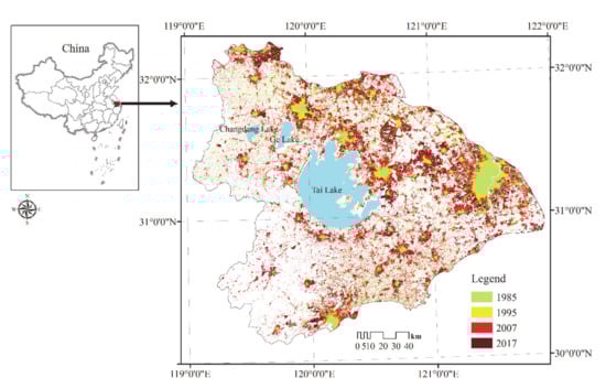 One of the major reasons for the basin’s degraded state was the expansion of developed land, which changed the natural state of the land surface and altered the original water flow pattern. According to TM (thematic mapper)remote sensing image interpretation, the developed/urban land areas in the Taihu Basin reached 9731 km2 in 2017 and its land use intensity reached 26.41%, which was 2.73 times, 2.10 times and 1.48 times greater than in 1985, 1995 and 2007, respectively. Some cities along the lake, such as Suzhou, Wuxi and Huzhou, had higher expansion rates than the average level of urban expansion in the basin. All these local governments were primarily focused on economic development and paid less attention to the constraints of water sensitivity; they therefore lacked an overall comprehensive management plan for spatial growth in the basin (Figure 2).