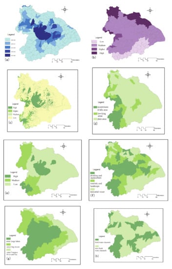- Water resources. The evaluation mainly includes the availability of surface and groundwater in a region. It comprehensively evaluates whether water resources are capable of meeting social, economic and ecological water demands. Overexploitation of water resources will likely result in a series of issues, such as reductions in flow along watercourses, the shrinking of wetlands, groundwater table declines, the formation of groundwater funnels (cones of depression), water pollution and land degradation []. Due to the spatial variations in precipitation and evaporation caused by regional climatic differences, water resources are unevenly distributed within a basin and the determination of available water quantity is very complicated. In this study, water system density and the relative abundance of water resources were taken as indices of regional water sensitivity. Water system density refers to the proportion of the evaluation unit that was covered by surface water, whereas the relative abundance of water resources was based on the ability to obtain fresh water resources given the area’s geomorphological conditions, which included low-relief plains, coastal areas, hilly terrain and mountains where large rivers and lakes are located.