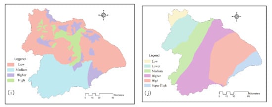 Regionalization evaluation indices of water sensitivity in the Taihu Basin: (a) water system density; (b) relative abundance of water resources; (c) importance of water ecology; (d) geomorphological characteristics; (e) water quality objectives; (f) use functions; (g) accessibility; (h) freshwater channels; (i) flood risk; (j) typhoon risk;.