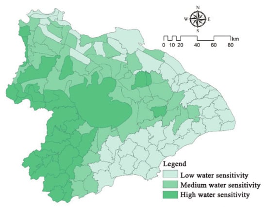 Medium water sensitivity areas (Medium BWSI). Areas possessing a BWSI between 0.32 and 0.52 were considered to have a medium water sensitivity. These areas were mainly located in the middle and northern part of the upper Taihu Basin and were geomorphologically characterized by hills and plains. These areas contain important ecological reserves and are drained by a few rivers that enter Taihu Lake. They possess higher water system density than High BWSIs and are more affected by flooding. They also have poor water accessibility. Despite their abundant water resources, the aquatic environment and potential for water-related disasters are quite low, resulting in their classification in the medium range of water sensitivity.