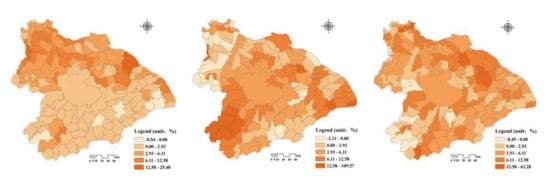 Overall, the intensity of expansion in urban development is influenced by both the original size of the developed land and its scale of expansion, which leads to different patterns and expansion intensities. Municipalities have lower expansion or construction intensity because the area of development is spread over a larger area. By contrast, the expansion rate in counties is higher. Between 1985 and 1995, rapidly expanding areas were largely concentrated in southern Jiangsu along the Yangtze River in the northern part of the Taihu Basin. Expansion was especially prevalent in Changshu, Taicang, Wujin, Danyang and Xishan. Between 1995 and 2007, rapid construction primarily occurred in the suburbs of Shanghai, the surrounding areas of Suzhou, Wuxi and Changzhou, northwest Hangzhou and Lin’an. The areal exploitation intensity in the upper reaches of the Taihu Basin was higher than the during the previous stage (1985–1995). Between 2007 and 2017, the developmental expansion intensity increased significantly, but the expansion areas were more dispersed, which indicates a flattening trend. However, the expansion intensity in the upper reaches of the Taihu Basin was lower than other regions (Figure 5).