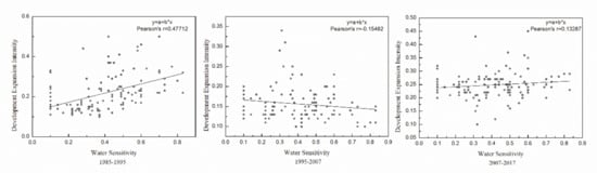 - For the period of 1985–1995, the developmental expansion intensity of all areas was above 0.1, while the BWSIs for areas with a relatively higher expansion index were mostly between 0.4 and 0.7. Areas with a higher BWSI had a higher developmental expansion intensity. Little correlation exists between spatial growth and water sensitivity. This lack of correlation may be related to the fact that rural surplus labor is used by most local cities and counties in the Taihu Basin for vigorous industrial development, resulting in rapid industrialization and urbanization in rural areas. However, due to the lack of comprehensive planning, the developed areas were fragmented. In addition, little attention was paid to the impact of development on water sensitivity.