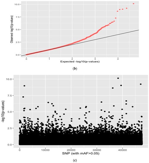 Outlier detection using principal components (PCs) shows the decay of eigenvalues confirmed to the use of K = 2 as optimal (Figure 8a). The Q-Q plot confirmed the expected uniform distribution of the p-values (Figure 8b). Figure 8c shows a Manhattan plot indicating the outlier SNPs that have been detected based on the expected FDR equal to 10%.
