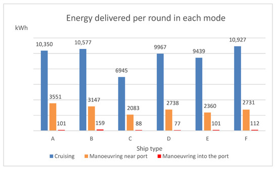 Figure 1 shows the actual power and energy delivered by the ME, which were obtained per round trip in cruising mode, the mode of maneuvering near port, and the mode of maneuvering into the port, respectively. Equation (5) was used.
