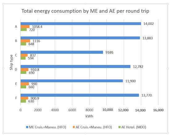 Figure 5 shows the total energy consumption during the same time for the ME and AE (kWh), taking into account the worst weather, hull, and performance propulsion system conditions. In this case, Equations (5) and (6) were used.