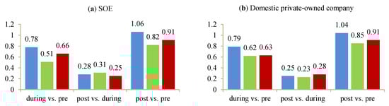 The results in Table 4 indicate that, for SOEs, there exists a significant difference among three dimensions of SD for pre- and post-COVID-19 periods, but there is no difference among dimensions of SD for the period during COVID-19, indicating the confusing state of Chinese SOEs during the pandemic. Figure 1a indicates that for Chinese SOEs, social sustainability was the most prioritized during the pandemic with a mean change (social responsibility, during vs. pre) in score of 0.78, but it was less prioritized than economic sustainability immediately after the pandemic (0.28 vs. 0.31); however, it was the most prioritized in a longer term after the pandemic comparing to economic and environmental sustainability (1.06 vs. 0.82 vs. 0.91). It would appear from Figure 1 that over the longer term SOEs prioritize social sustainability more than other companies (with a mean change of 1.06), followed by private-owned companies (1.04), individual-owned companies (0.98), and FIEs (0.88). It is not surprising given that Chinese SOEs have reportedly donated RMB 5.8 billion to help fight COVID-19, accounting for 47% of the total amount of corporate donations China received in response to COVID-19, while Chinese domestic private companies contributed 41% and FIEs only 12% []. Chinese SOEs’ generosity in philanthropy has been well documented and the reason for their generosity is that they are highly integrated with the state and thus have looser budget constraints []. However, the motive of Chinese domestic private companies’ donations, especially when facing a large-scale crisis, is mostly related to the protection of their property rights and nurturing of political connections, which in turn would lead to better profitability []. However, even with the long-term priority shift to the social dimension of SD after the pandemic, economic sustainability has remained absolutely essential post-COVID-19 for Chinese SOEs (4.47, Table 4), implying the falling importance of environmental sustainability at the post-COVID-19 era. Hence it would seem that Chinese SOEs are not prioritizing environmental sustainability as a result of COVID-19.