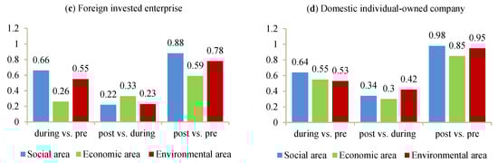 For the Chinese domestic individual-owned companies, Table 4 suggests that there is no statistically significant difference among the dimensions of SD for each COVID-19 stage. However, just like other types of companies, Chinese domestic individual-owned companies see economic sustainability as essential throughout the pandemic stages (pre, during, and post, Table 4). However, in terms of the changes in score, Figure 1d indicates that Chinese domestic individual-owned companies prioritized social sustainability the most during COVID-19 with mean change (social sustainability, during vs. pre) being 0.64, followed by economic sustainability (0.55) and environmental sustainability (0.53). The most prioritized immediately after COVID-19 is environmental sustainability (0.42), followed by social sustainability (0.34) and economic sustainability (0.30). But over the longer term, the individual-owned companies prioritized social sustainability the most (0.98), followed by environmental sustainability (0.95) and economic sustainability (0.85).