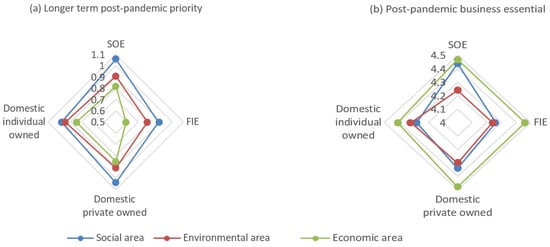 Based on these results, Figure 2 provides a picture of the longer-term post-pandemic priority and post-pandemic business essential for companies with different ownership. It is clear that hypothesis 1 has failed. Chinese SOEs and private companies have responded to COVID-19 by prioritizing social sustainability more during the pandemic and also in the longer term following the pandemic. By way of contrast, FIEs and individual-owned companies have prioritized social sustainability less since the outbreak of COVID-19 (Figure 2a). This result is consistent with the findings of Li and Zhang [], Zhang et al. [], and Oh et al. [] that state ownership has a positive relationship with social performance. However, the result is contrary to those of Oh et al. [] and Lee et al. [] who found that foreign invested firms are good CSR performers. It is a disappointing finding considering the large number of FIEs in China (960,725 by the end of 2018 []), whose contribution to social and environmental development would make a difference to China’s long-term sustainability.