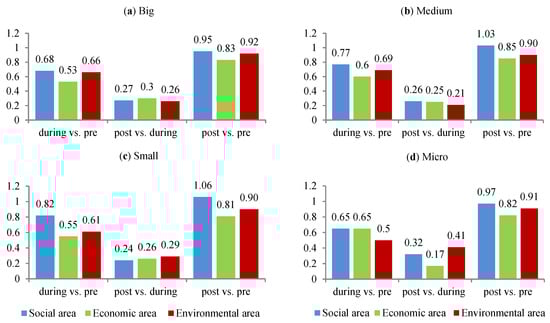 Figure 3 indicates that comparing to pre-COVID-19, big-, medium-, and small-sized companies prioritized social sustainability the most during the pandemic among three areas of SD with the mean changes (social sustainability, during vs. pre) being 0.68, 0.77, and 0.82, respectively (the left clusters of Figure 3), while micro-sized companies prioritized both social and economic sustainability during the same timeframe (both are 0.65). The priorities vary for the period between post and during COVID-19 (the middle clusters of Figure 3), while large companies prioritize economic area (with the mean change (economic sustainability, post vs. during) of 0.3), medium-sized companies prioritize social area (0.26), small and micro companies prioritize environmental area (0.29 and 0.41). However, comparing to pre-COVID-19 period, the post pandemic priorities are still social issues for companies of all sizes (the right clusters of Figure 3). But surprisingly, small companies (1.06) appeared to emphasize social sustainability the most, followed by medium-sized companies (1.03) and micro companies (0.97). Big companies appeared to place relatively less emphasis on social issues after the pandemic (0.95) as illustrated in Figure 4a. Hence, hypothesis 2 is proved to be false.