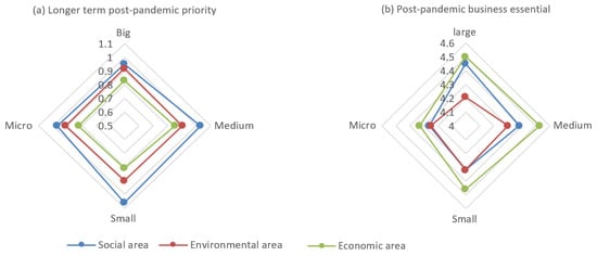 Again, the economic dimension of SD remains essential for companies of all sizes, especially the medium and large companies (Figure 4b). This leaves the environmental side of SD to be the most vulnerable, another indication of post-pandemic environmental rebound effect.