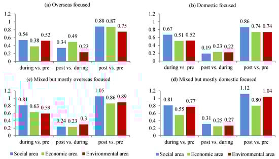 If the mean change (environmental sustainability, during vs. pre) was bigger than zero, then environmental sustainability was assumed to have been prioritized more during COVID-19 []. If the mean change (environmental sustainability, post vs. during) was bigger than zero, then environmental sustainability was assumed to have been prioritized immediately after the pandemic. If the mean change (environmental sustainability, post vs. pre) was bigger than zero, then environmental sustainability was assumed to have been prioritized over the longer term after the COVID-19 impact had ended. The bigger the mean change, the higher the level of the prioritization. The same interpretations were applied to the other two dimensions of SD.