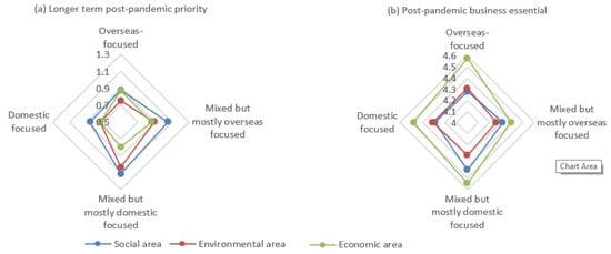 Therefore, the test of hypothesis 3 is passed. Indeed, possibly because of their better financial situation during the pandemic (38% of them were impacted badly while the number for the whole sample was 41%), companies with mixed markets prioritized social sustainability the most after the pandemic, followed by environmental sustainability. The levels of prioritization of mixed-market companies towards social and environmental sustainability are higher than companies that are solely overseas or domestic focused (Figure 6a). This finding may be explained by the slack resources theory [] and available funds hypothesis []. However, all companies, regardless of their market focus, consider the economic dimension of sustainability as essential to their business. This is more obvious for overseas-focused companies and companies having a mixed market but more domestically-orientated (Figure 6b). Environmental sustainability is the least likely to receive attention during the pandemic and in the longer term following the pandemic.