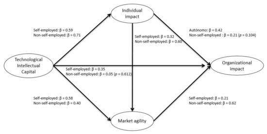 The objective of this work was to investigate the relationships between TC and individual impact, organizational impact and market agility in self-employed and employed personal trainers hired by fitness centers. Thus, Hypothesis 1 predicted a positive relationship between TC and individual impact, an aspect that is confirmed for both employed persons and those who are self-employed. This finding is consistent with those previously provided by Delone and McLean [35], who pointed out that workers’ TCs would be directly related to their performance, by allowing them a better understanding and adaptation to the context in which they are immersed. Furthermore, Aulawi et al. [118] indicated that this relationship would be mediated by the ability of workers to share their technological knowledge. The relationship between TC and individual impact seems to remain the same regardless of whether the workers are employed or self-employed; so, the influence of organizational and/or contractual factors would not have weight on this occasion.