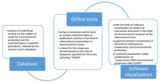 As can be seen, bibliometric analysis of research trends is very widely used in various areas of scientific knowledge, in particular, sustainable social development and the introduction of new areas of cooperation for innovation development. Therefore, we believe that the bibliometric approach can be effectively applied to the analysis of international cooperation in the field of environmental protection. At the same time, it is necessary to note the importance of the issue of COVID-2019 influence in this area. We have limited the scope of analysis of the bibliometric approach in the context of the research subject. Of course, COVID-2019 has an extensive sphere of influence, that can be studied in different areas of economic and social development, health care, and industrial potential. In this article, we intend to delve deeper into the analysis of a specific research area related to international cooperation projects in environmental issues that are affected by the COVID-2019 situation.