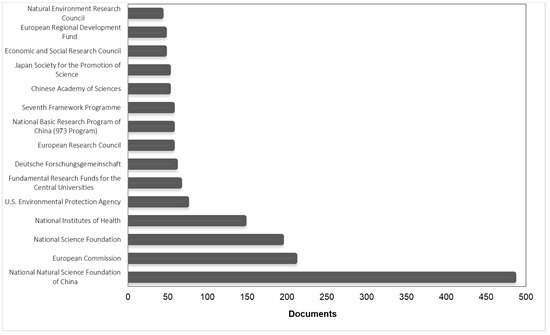 As can be seen in Figure 4, the main sources of research funding can be attributed to the National Natural Science Foundation of China (485 publications), the European Commission (210), the National Science Foundation (193), the National Institutes of Health (146), and the U.S. Environmental Protection Agency (74).