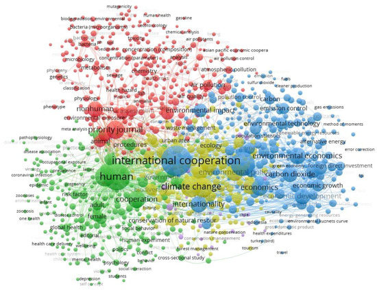 Figure 7 shows the visualization of interaction zones by keywords in publications on the theme of international cooperation in environmental research and conservation. Five clusters were identified (Figure 7): green—international cooperation for assessing risks to public health, in particular in the field of biosafety and the spread of social infections, with a focus on COVID-19 in 2019 and 2020; yellow—describes the related interaction between other clusters in the field of national and international mechanisms of cooperation in the regulation of greenhouse gas emissions and climate change; blue—brings together research areas in the field of economics of environmental management and control.