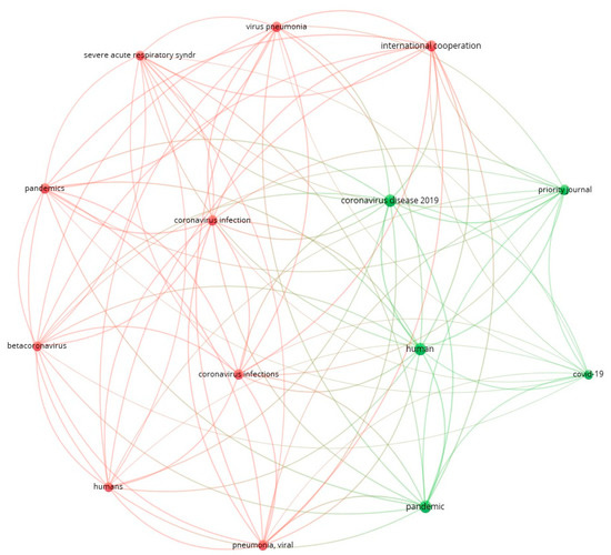 For a more detailed consideration of the impact of COVID-19 on the trends of international cooperation in the field of environmental research, the term “COVID” was added during the search in the database, and a network of visualization of keyword interaction in publications was formed, which is presented in Figure 8. Two clusters are highlighted here: a red cluster associated with research on coronavirus infections and their pandemic spread, and international collaboration to counteract this spread; a green cluster describes the current state of COVID-19 and increasing publication activity in this research area. It should be noted that this direction considers the impact on human health and refers more to the medical sciences.