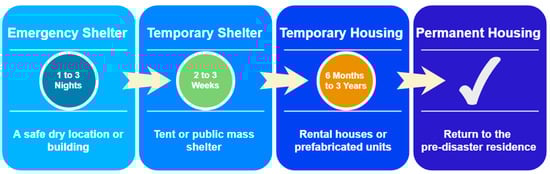 When a disaster strikes, the impending population displacement requires post-disaster housing accommodations while conducting the necessary reconstruction to their permanent residence. There are three phases for post-disaster accommodations, which are shown in Figure 1 [,,,,,].