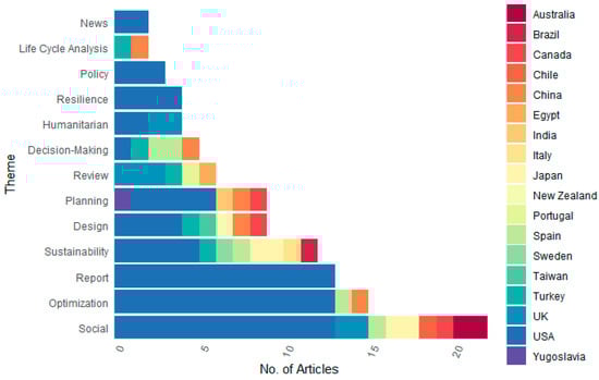 Additionally, the geographic distribution of first authorship is examined under each theme. Scholars from 14 countries have been contributing to post-disaster housing research. Articles published by authors in the USA constitute the largest portion across all themes except for ones that include life cycle analysis, decision-making, review, and humanitarian aspects. In contrast, agency reporting, news articles, policy, and resilience are themes corresponding to authors in the USA only. Decision making, social, design, and sustainability are global themes with a wide geographic distribution and articles published by authors from across the world.