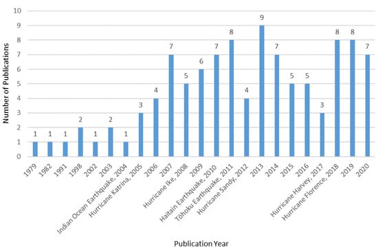 Figure 3 is the breakdown of articles by publication year, with the one hundred and seven articles spanning from nearly 1979 to 2020. Major impact disasters are also indicated on the x-axis. It is interesting to note the fluctuations and corresponding nature to the disaster events. Since 2005, temporary housing research has seen a cyclical pattern with productivity peaks around a year after a major disaster (e.g., 2007, 2011, 2013, 2018, 2019). This pattern corresponds to a series of international events that reiterated the importance of temporary housing through the mass displacements of people.