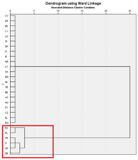 Dendrogram from the hierarchical clustering analysis using the Centrold method (six countries in the red box are grouped into one cluster).