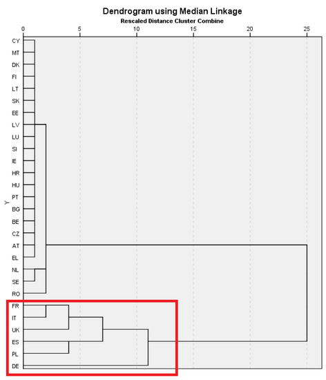 Dendrogram from the hierarchical clustering analysis using the Median method (six countries in the red box are grouped into one cluster).